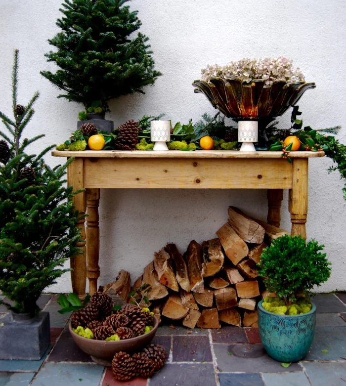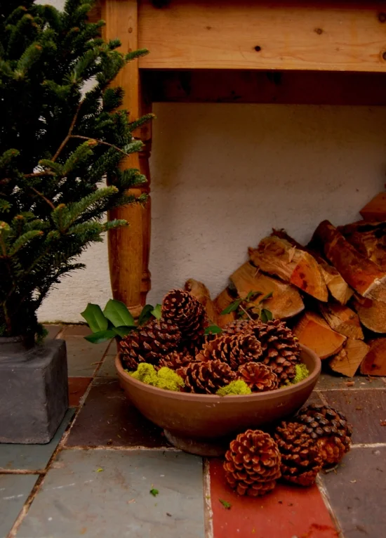 I began by grabbing an old pine table from my parent's basement to be used as an pseudo alter. From there I added random pieces of greenery that were left over from decorating the rest of the house. Holly, boxwood, and pine fill the areas around a pottery compote and the small Christmas tree that my Mother had purchased. I gathered up a pile of firewood and stacked it to one side underneath the table to fill the void. Adding a small boxwood (the same one I used in our Thanksgiving table scape) and a bowl of pine cones filled the visual gaps and distributed the pieces asymmetrically through the space.