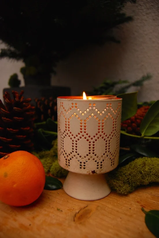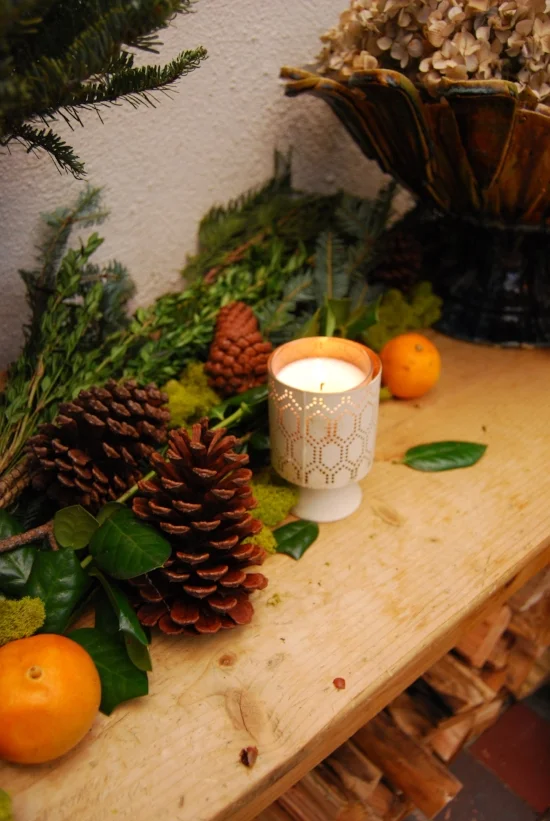 The "shrine" wasn't looking all that merry, so I brightened it up with some votive candles and a few Naval Oranges. People have mocked me in the past for using oranges in Christmas decor. Funny enough, Oranges are the most Christmas appropriate fruit as they are harvested in the winter. So, just to spite my idiotic dissenters, I threw them in to contrast with the mostly green and brown background of the setup. Finally, I added in bits of Reindeer Moss (ironically Holiday appropriate) to fill in openings and layer in another hue of green.